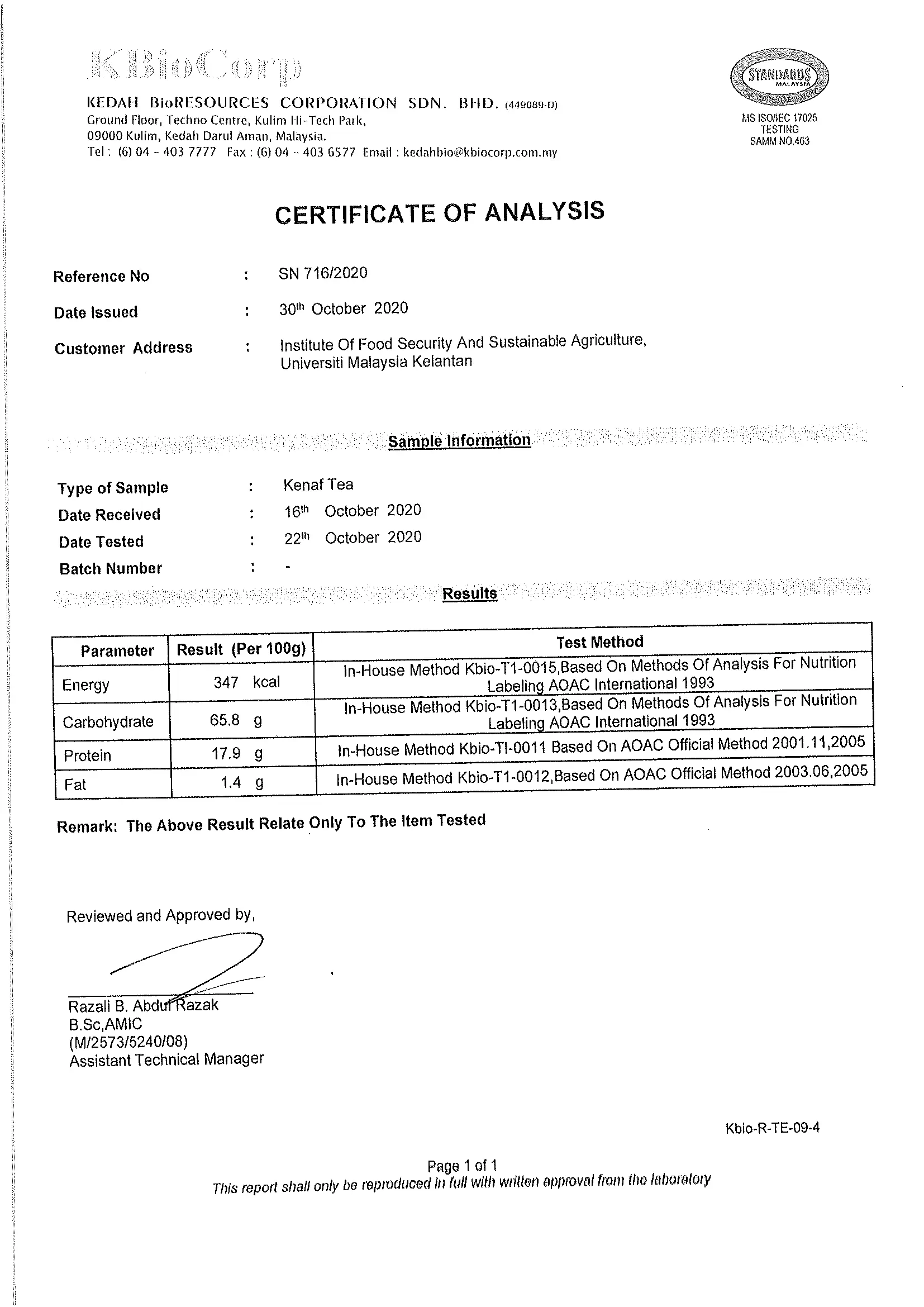 Biokenaf® telah dikelaskan oleh Kementerian Kesihatan Malaysia (KKM) sebagai makanan kesihatan befungsi tidak dikawal.