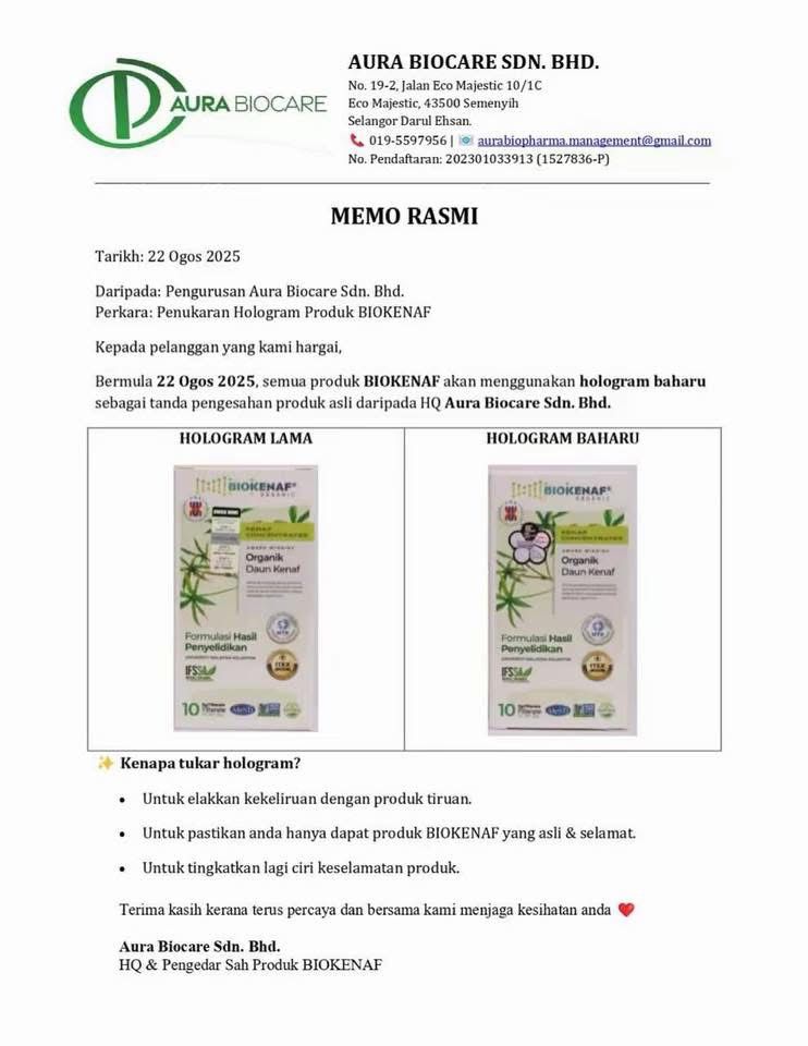 Biokenaf® mempunyai sistem hologram. Pastikan setiap kotak anda mempunyai sticker hologram.